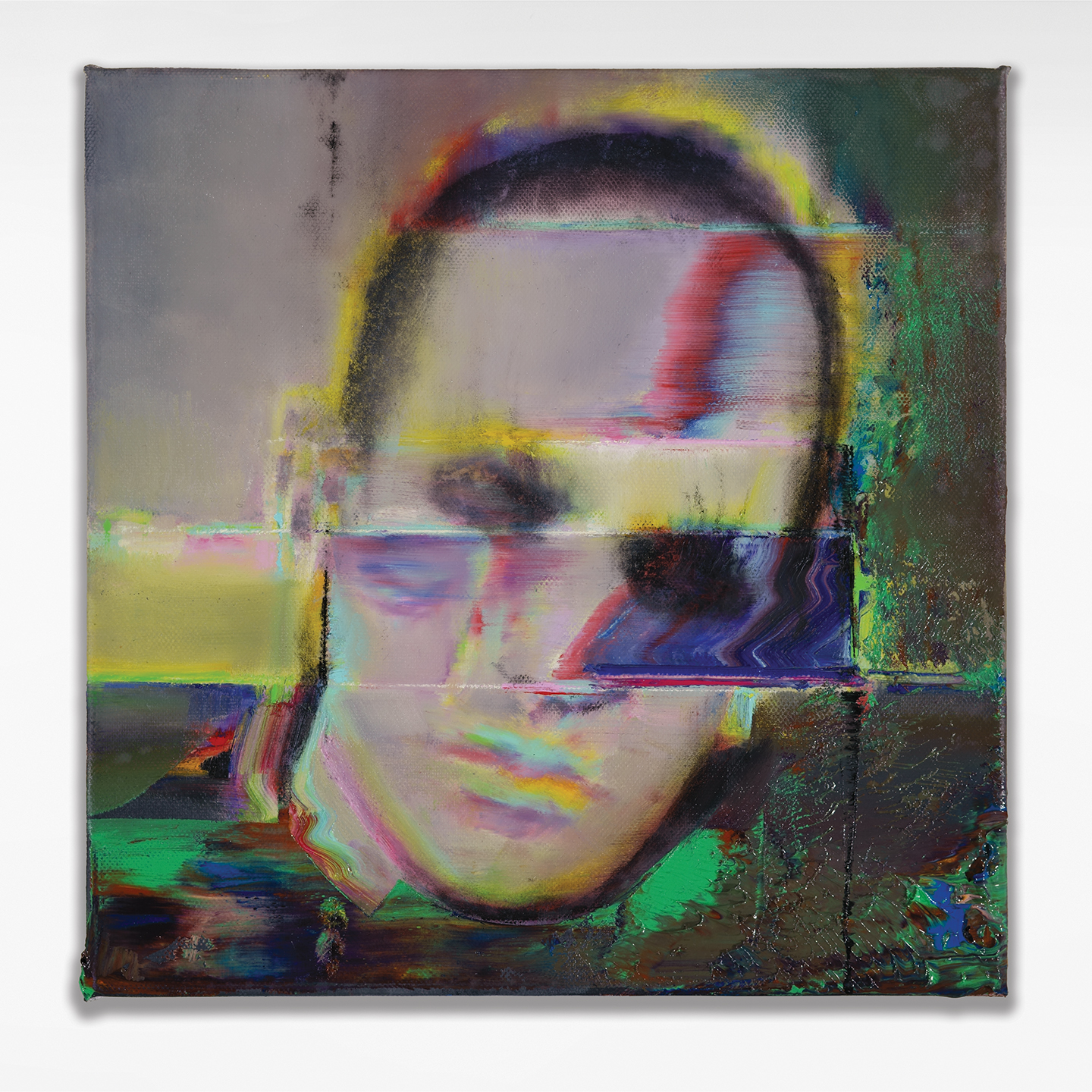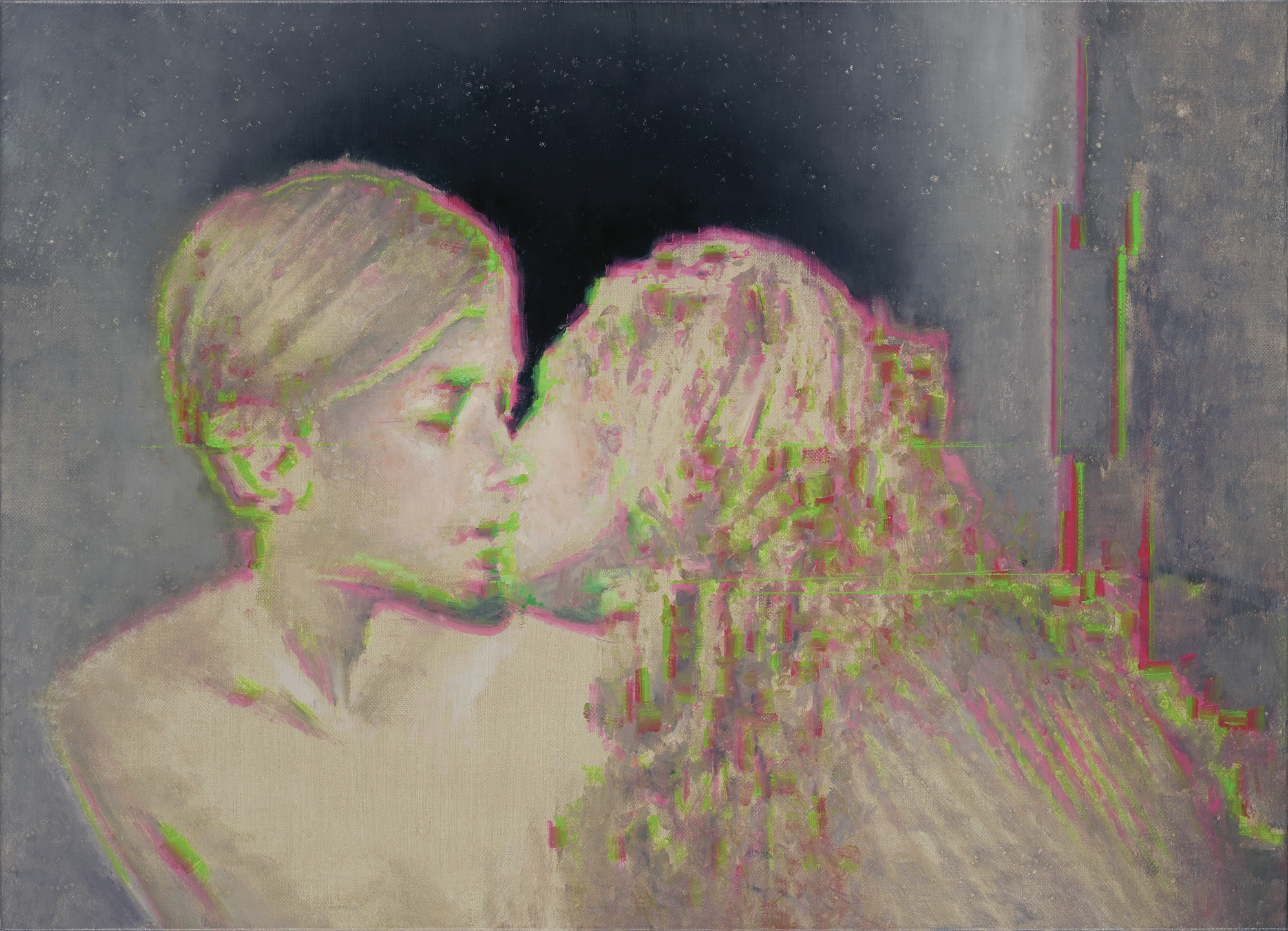 In his painting Complementary Love, an intimate kissing scene is disrupted by green and red lines that refer to the phenomenon of digital noise, turning this peaceful, idyllic moment into something that suddenly looks as though viewed through a damaged data file or a mediating technological device. As usual, the depiction of a fragmented reality and the appearance of digital glitches play significant role in Szűcs’s latest works. The figure of the Disappearing Singer or the portrait of Bergman seems to dissolve into space before blurring into pixels and disappearing into the ether. This image-glitch is not merely an aesthetic device but also symbolizes the transience of identity, memory, and presence, while Szűcs makes clear references to the world of cinema, especially to creators known for their surreal atmospheres (David Lynch, Ingmar Bergman).