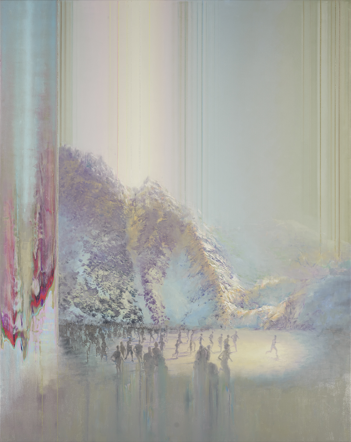 His monumental work, Escape appears at first glance to be a mesmerizing landscape in pastel colours. On closer inspection, however, it seems more haunting and disturbing, as a group of people fleeing from reality into the digital world—or vice versa—confront the disintegration of the reality they once knew and search for their new place in either world. This work, like the other paintings in the exhibition, is charged with secrets and tensions. A pair of pistols turned toward one another, hands slipping something into a pocket, an enigmatic body waiting behind a curtain or hidden beneath cascading hair, and a powerfully lit handshake of figures encircled by shining stripes—all evoke unease, while conjuring a moment torn out of space and time and its inherent elusiveness.