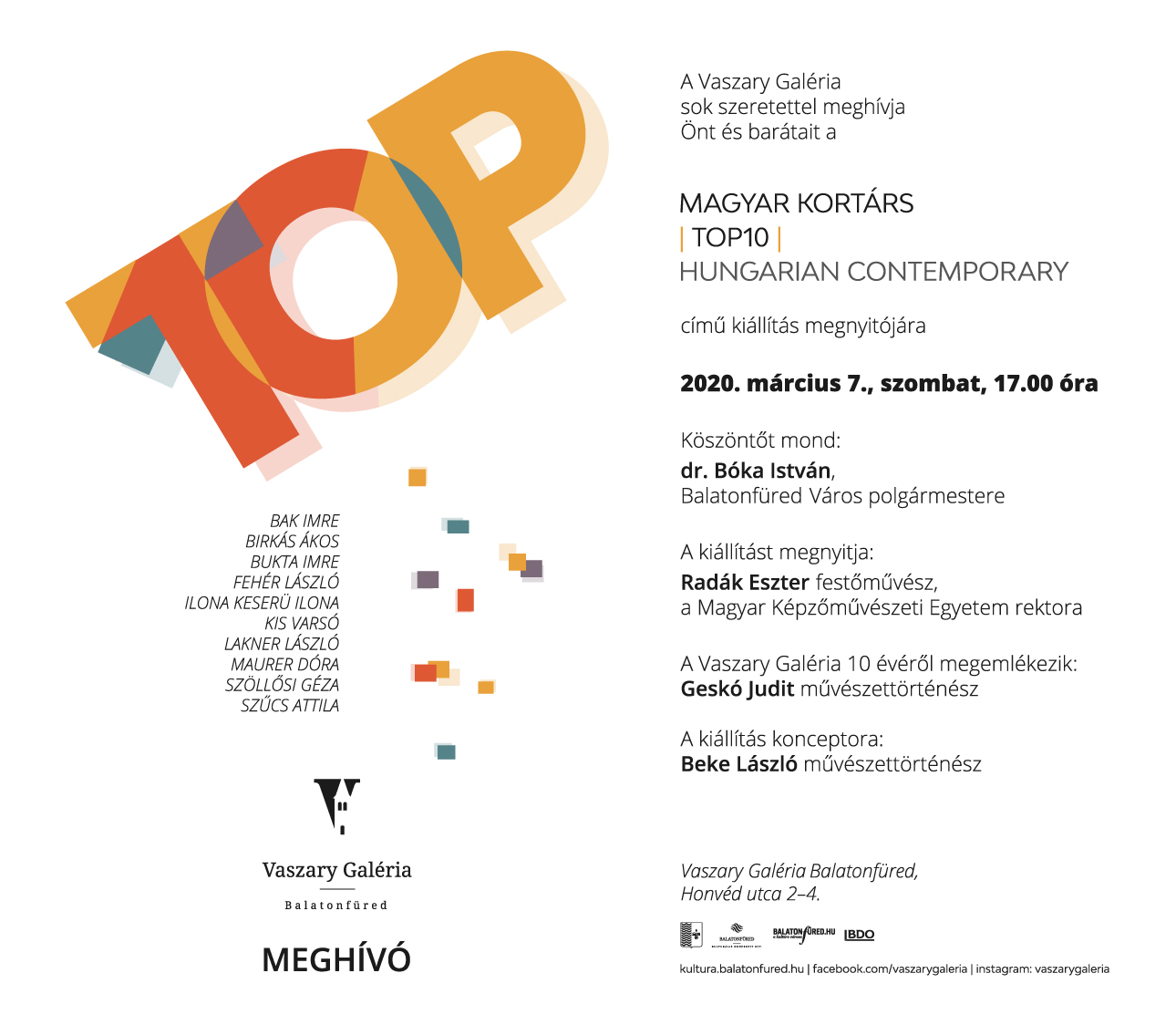 A balatonfüredi Vaszary Galéria megnyitásának tizedik évfordulóján 2020. március 7-én bemutatja a kortárs magyar képzőművészek top-tízes listáját.