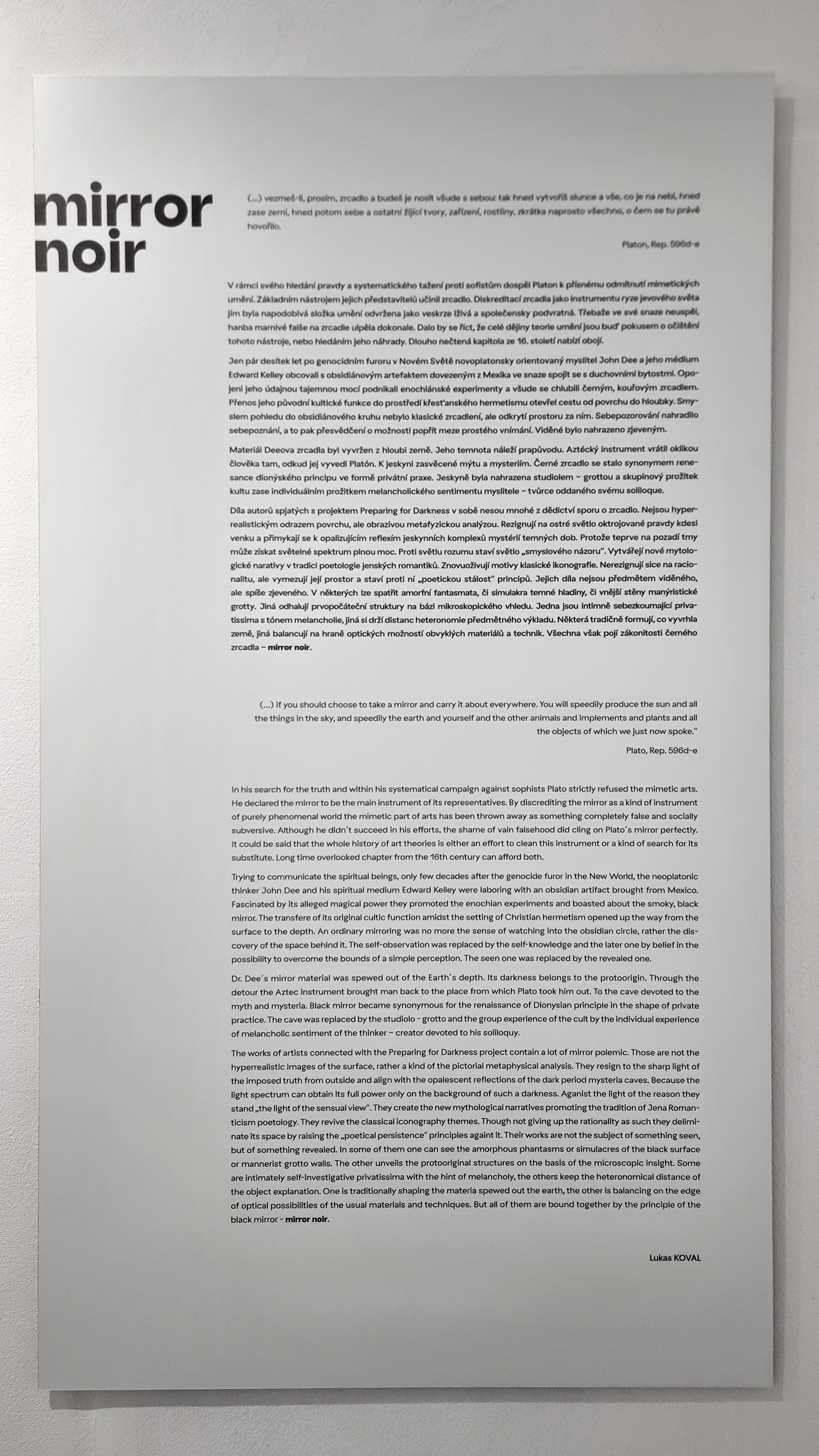 The surface of a polished obsidian. An artifact interconnecting cultures, ages and dimensions as an interpretive key. The abundance of a metaphor applied to a selection of works by authors associated with the Preparing for Darkness project. Mirroring on the surface and in the depth. The darkness of the grotto as a condition or starting point for an enlightened reflection. All this displayed by „Mirror Noir.“