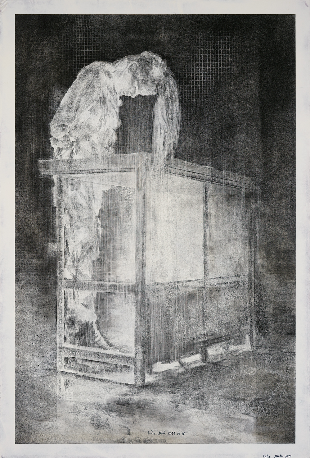 Drawing, acrylic spray, charcoal, graphite on gesso primed paper 90x60,5cm 2021 01 18