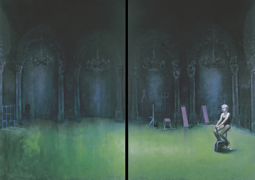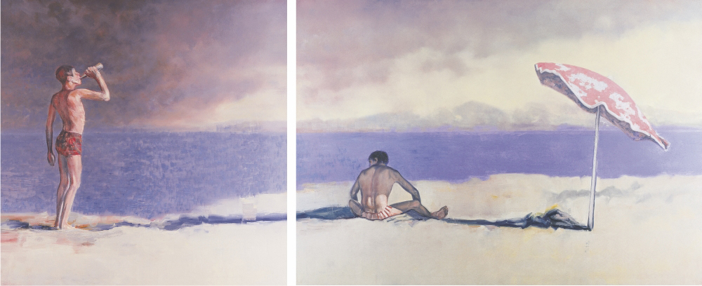 sun bathers with umbrella o,c. 140x340cm. diptich. 2000