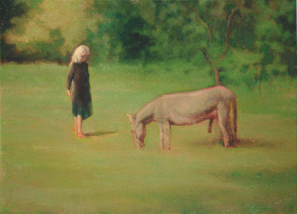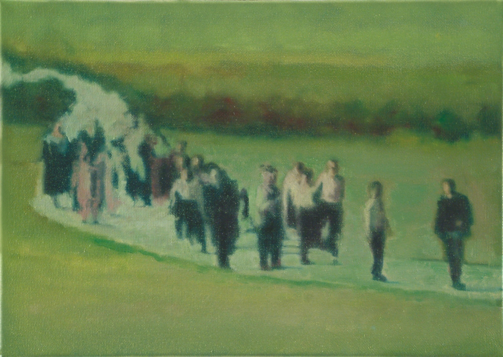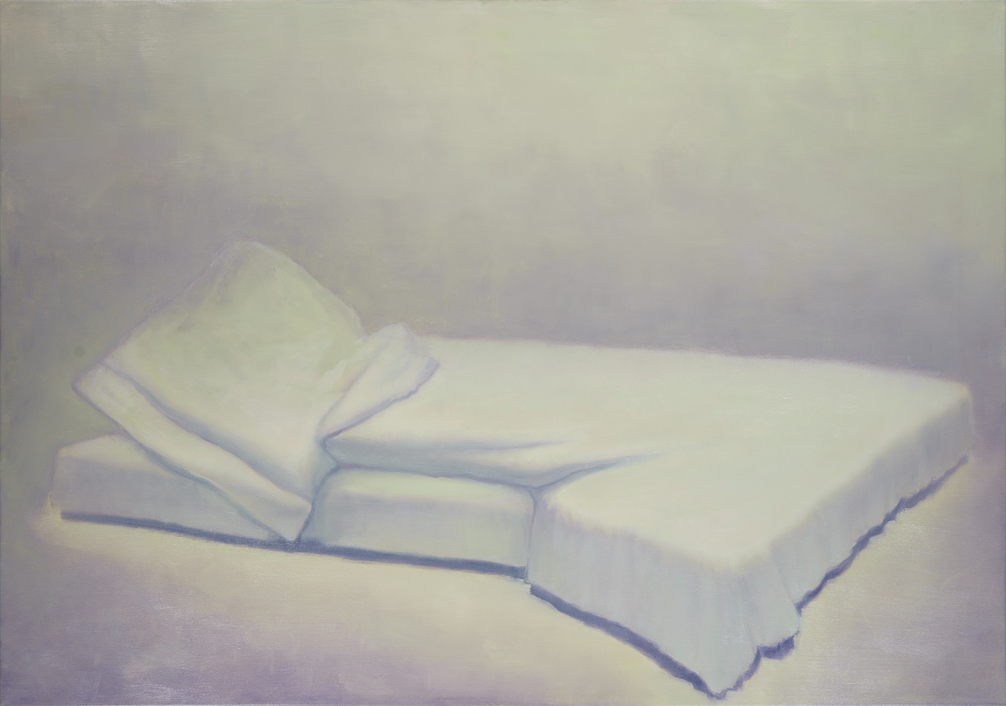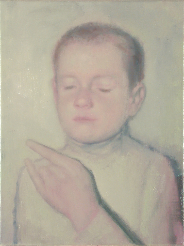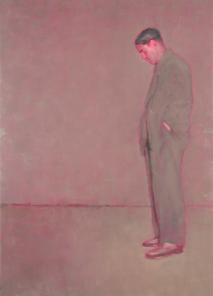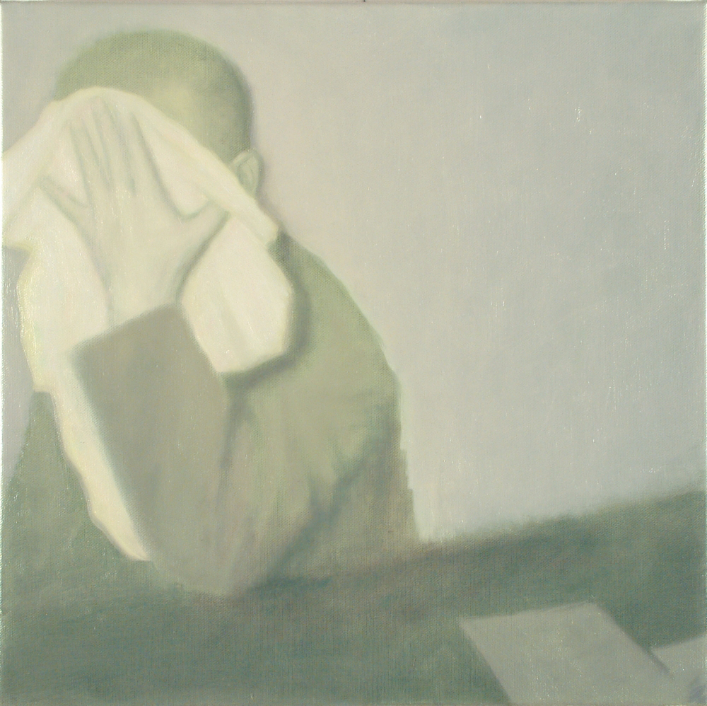 figure hiding behind a pillow o,c. 140x200cm. 2003