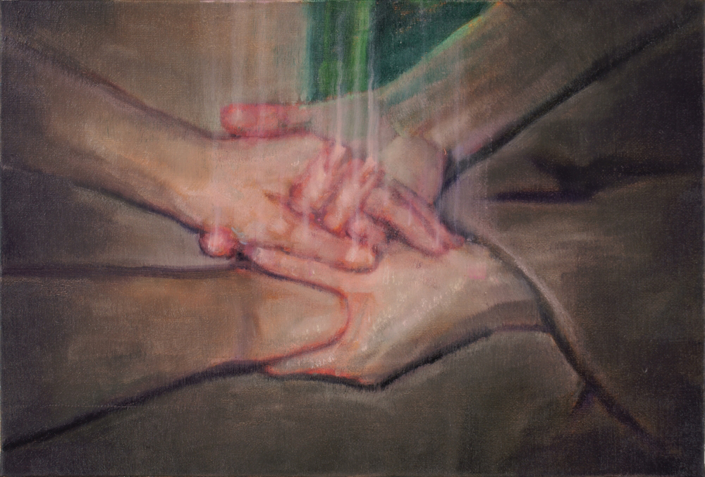 attila szucs, merging hands, oil on canvas mounted on board, 27x40cm. 2013