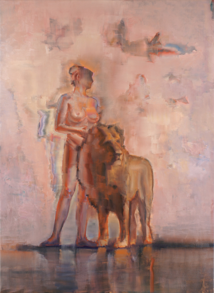 attila szucs, nude with lion, oil on canvas, 220x160cm. 2013
